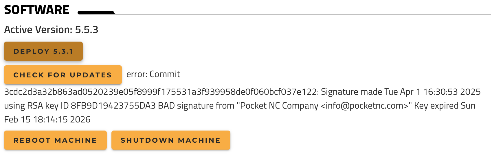 CHECK FOR UPDATESerror: Commit a905d77caacfb32f367518dcca8b7501ca2354a3be86c7d5ebc9c20f365d5926: Signature made Mon Oct 16 21:12:24 2023 using RSA key ID 8FB9D19423755DA3 BAD signature from “Pocket NC Company info@pocketnc.com” Key expired Wed Sep 20 15:59:53 2023