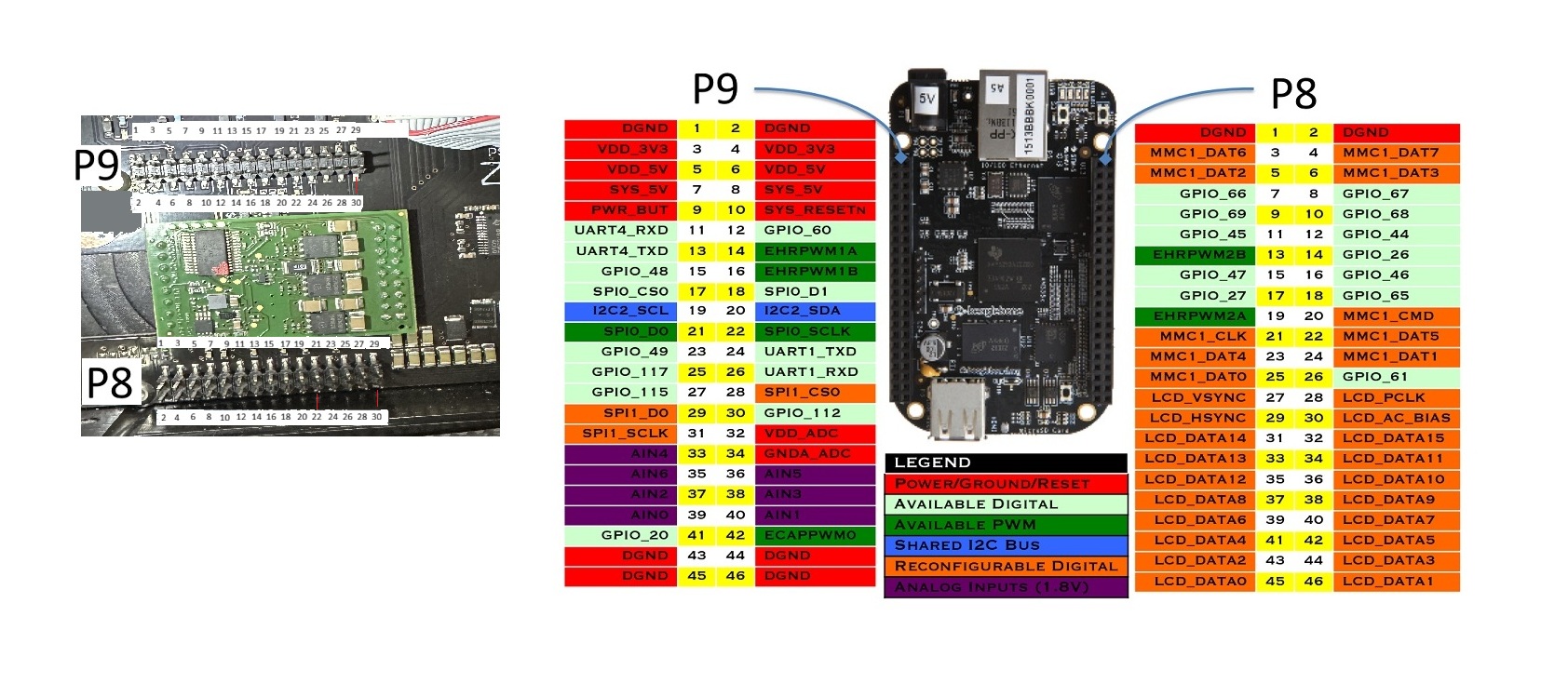 I took a pic of the BBB and daughter board. This showed me the free pins (assuming they are actually free!). P9 GPIO_20 (pin 41) looks free (would love some verification here ;)).