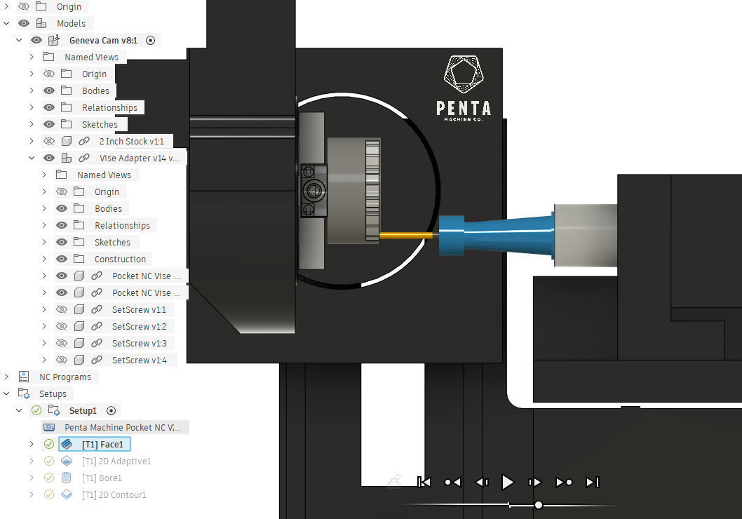 I used fusion to create the toolpaths for a geneva cam. When I plug it into the penta simulator the top of the model is not at the correct distance from the top of the b table. My z movements are wrong. I have tried top of stock, top of model, and bottom of both. Each creates a different z distance problem. I am using the Pocket NC vise to hold the material and used a model of the vise to create the setup for machining. I am at a loss.